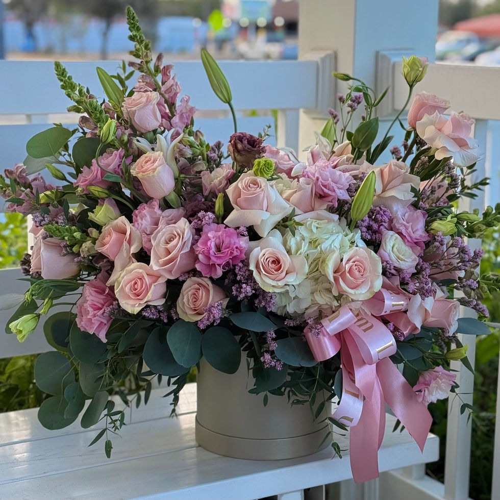 A delicate array of pink and blush roses, complemented by subtle hints of purple and white blooms, creates a vision of grace and sophistication. This lush arrangement is artfully presented in a modern cream hatbox, adorned with a matching pink ribbon, making it an exquisite choice for weddings, anniversaries, or simply to convey affection. Perfect for adding a touch of refined beauty to any occasion.