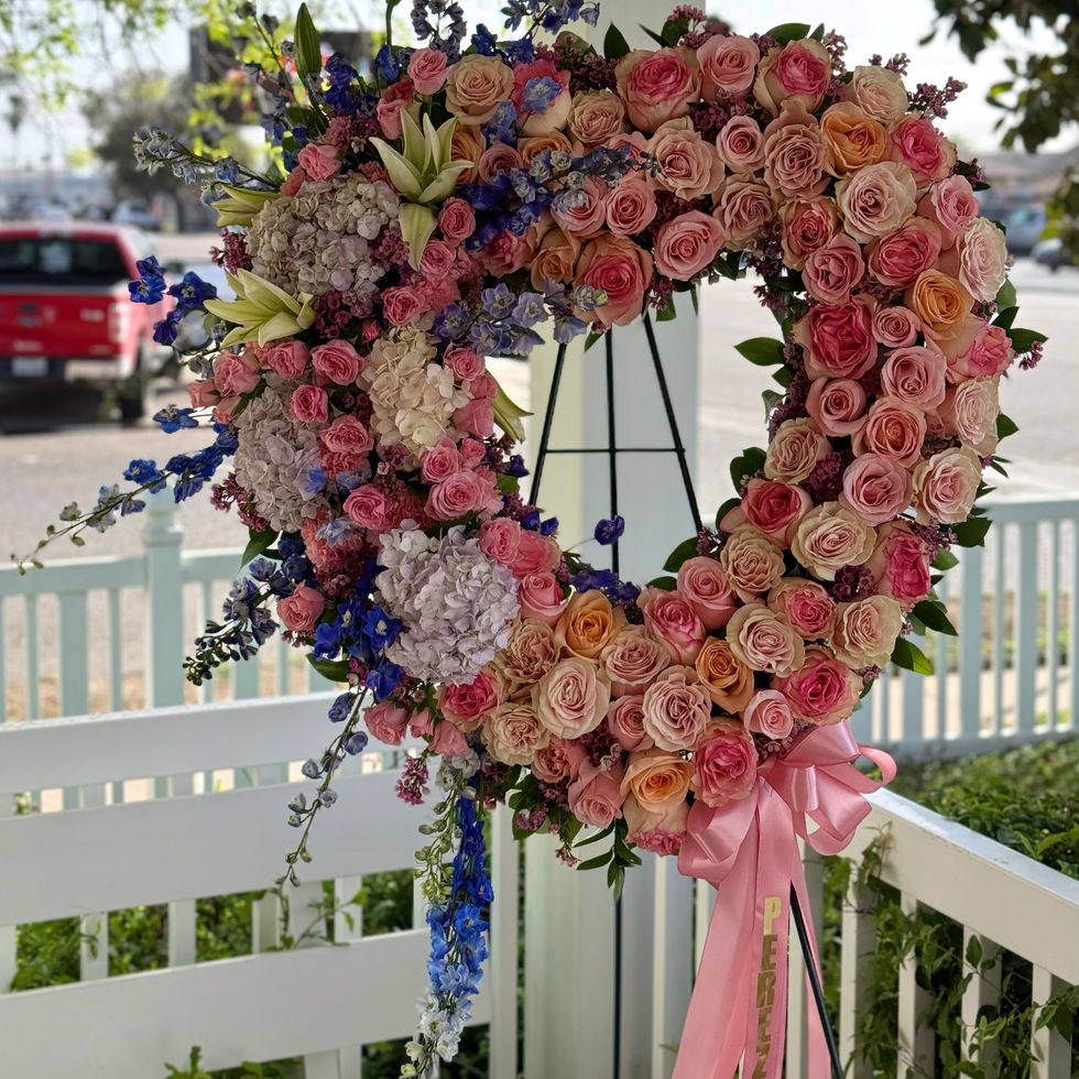 The Everlasting Love Heart is a stunning open-heart standing tribute adorned with elegant shades of blush, peach, and pink roses, accented by delicate hydrangeas, lilies, and soft blue delphinium. Finished with flowing pink ribbon, this design is a beautiful symbol of eternal love, remembrance, and heartfelt farewell.