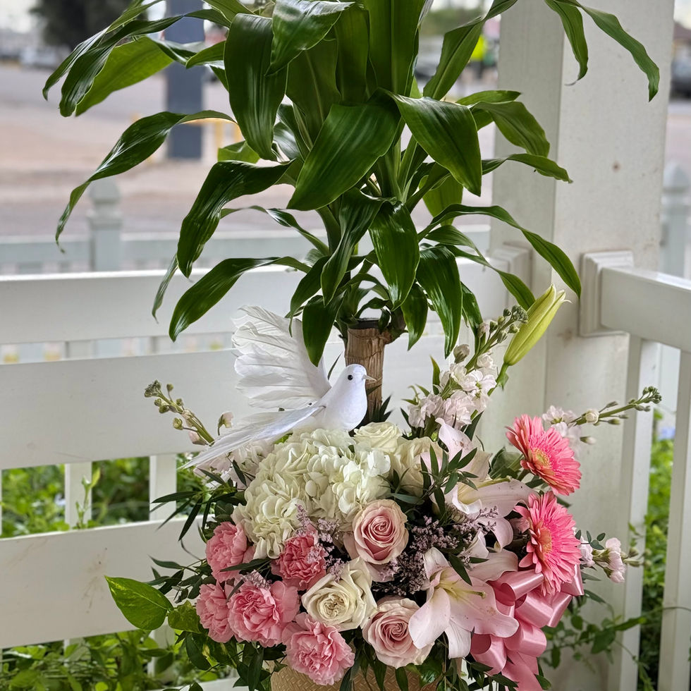 This graceful Dracaena fragrans sympathy arrangement features lush green foliage paired with soft pink roses, carnations, and gerbera daisies, accented by white hydrangeas. A white dove symbolizes peace, nestled in a stylish gold-textured pot—ideal for expressing heartfelt condolences with serenity and elegance.