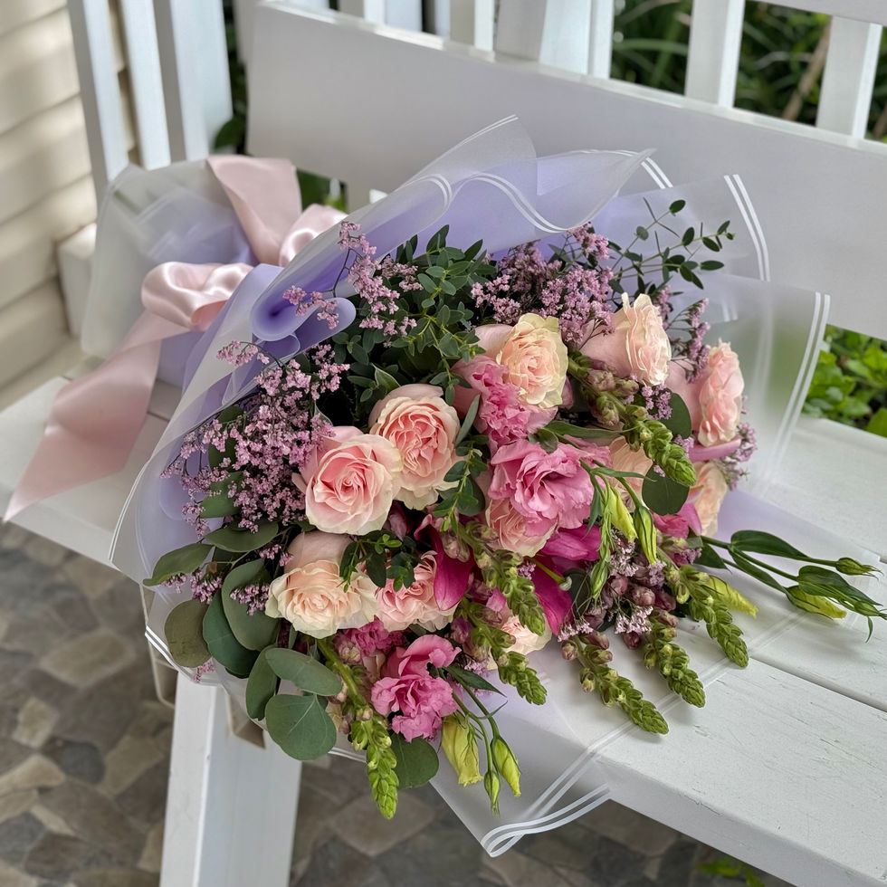 Explore the elegance of our 'Pastel Perfection Bouquet,' a beautifully crafted arrangement that brings a touch of sophistication to any occasion. Composed of pastel pink roses, lilac blooms, and pink snapdragons amidst verdant foliage, and finished with a graceful lavender bow, this bouquet radiates charm and grace. Perfect for birthdays, Mother’s Day, or simply showing your appreciation with style.