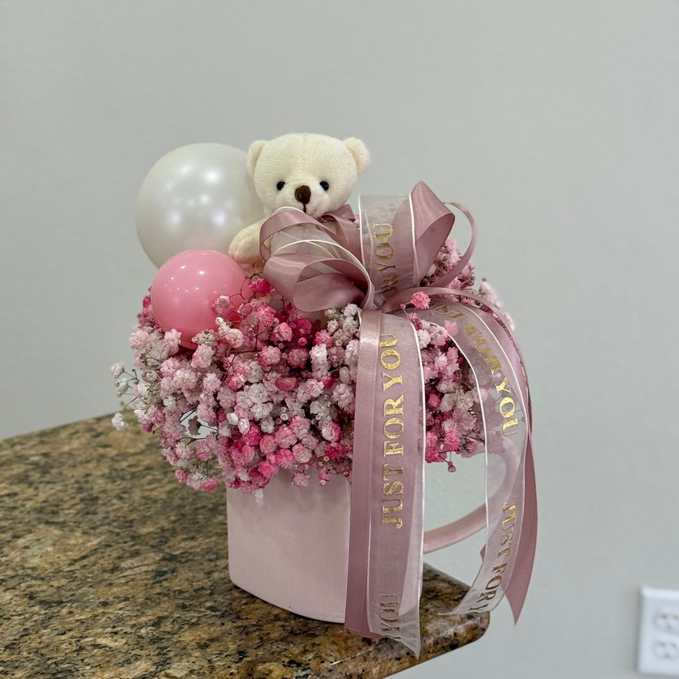 A dreamy pink baby’s-breath cloud in a keepsake coffee mug, topped with a sweet teddy and soft balloons—finished with luxe ribbon for the cutest surprise.