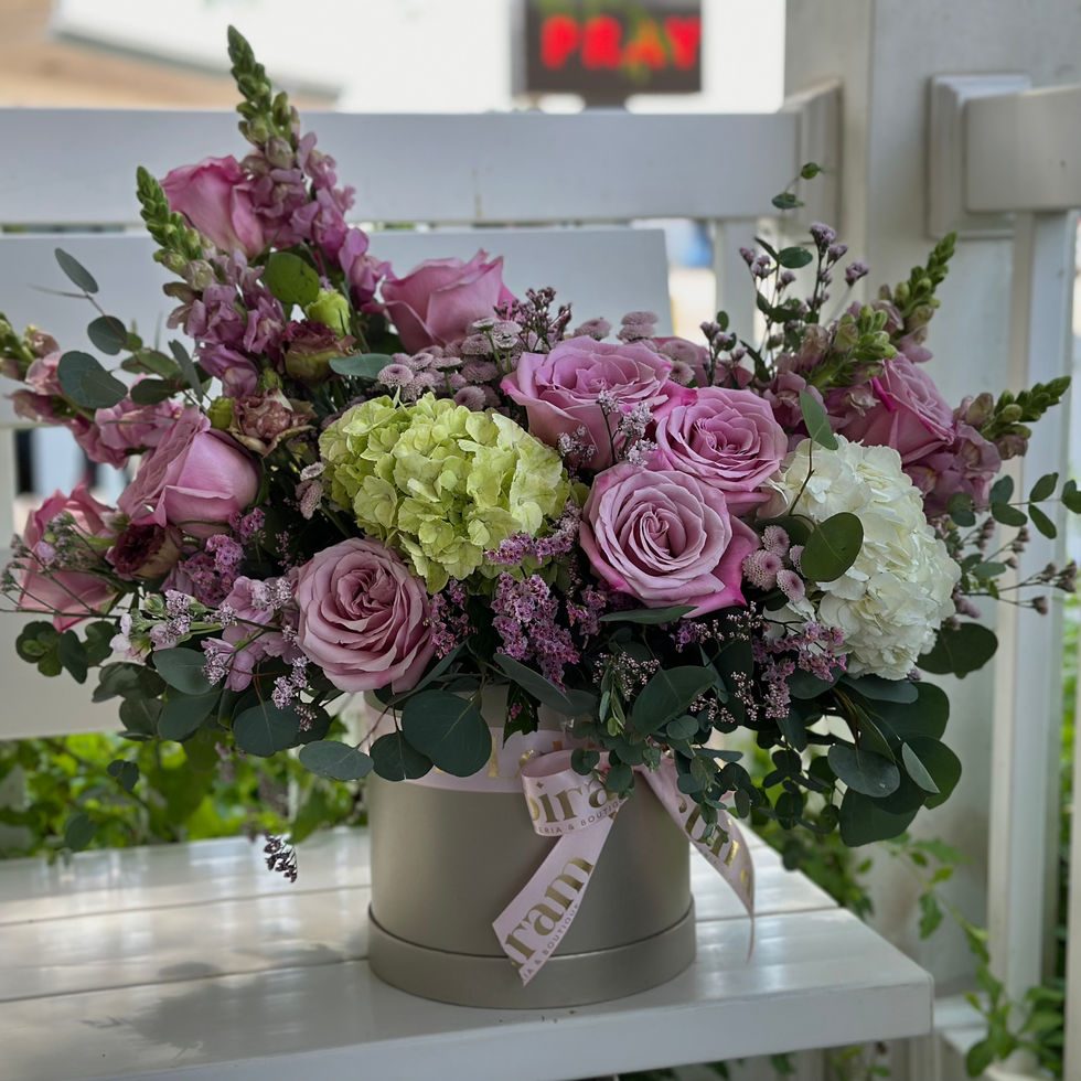 Soft, elegant, and timeless—Whispering Mauve enchants with gentle lavender roses, creamy hydrangeas, and delicate fillers in a graceful hatbox. This arrangement radiates serene beauty, perfect for celebrating love, gratitude, or simply brightening someone’s day. A refined gift for any occasion.